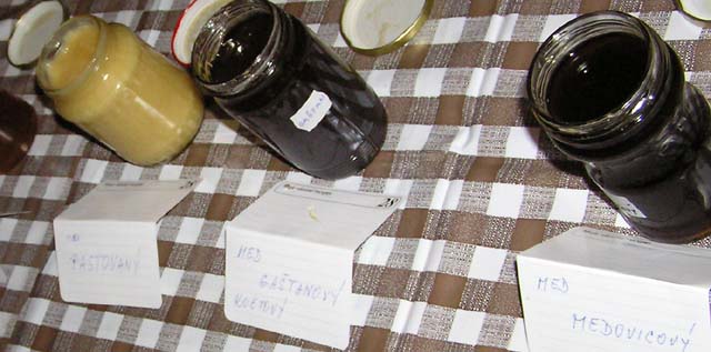 K dispozícii bolo 9 (1 vzorka skysnutého repkového medu) vzoriek medov, ktoré mohol ochutnať každý navštevník. Určitou raritou, aspoň pre mňa, bola prítomnosť gaštanového medu. Jeho farba by zmýlila nejedného včelára a tento med by zaradil určite k medovicovým medom. (klik na obrázok pre zväčšenie)