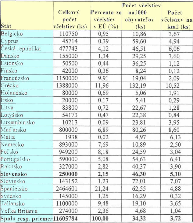 Medzi krajiny s najvyšším počtom včelstiev na počet obyvateľov patria Grécko (132 včelstiev na 1000 obyvateľov), Maďarsko (80) a Slovinsko (72). Pomerne vysoký počet včelstiev majú ešte Španielsko (62), Portugalsko (55), Česko (46) a Slovensko (46). V siedmich krajinách dosahuje početnosť včelstiev na 1000 obyvateľov hodnôt 11 a menej, konkrétne je to Veľká Británia, Malta, Holandsko, Írsko, Fínsko, Belgicko a Nemecko. Podobná situácia nastane aj vtedy, ale prepočítame počet včelstiev na veľkosť územia jednotlivých členských krajín. Nad 5 včelstiev na km2 dosahujú Grécko, Maďarsko, Slovinsko, Portugalsko, Malta, Česko a Slovensko, naopak Lotyšsko, Švédsko, Írsko a Fínsko nedosahujú v priemere ani 1 včelstvo na 1 km2. V absolútnom vyjadrení je najviac včelstiev sústredených na území Španielska (21,3 % zo všetkých včelstiev registrovaných vEÚ), Grécka (12%), Francúzska (9,9%), Talianska (9,5%), Poľska (8,2) a Maďarska (6,9%). Slovensko sa na celkových stavoch včelstiev v EÚ podieľa cca 2,15 %, čo je viac ako územný podiel (Slovensko tvorí 1,2% územia EÚ). Vybrané parametre zavčelenosti územia jednotlivých členských krajín EU sumarizuje tabuľka 1.