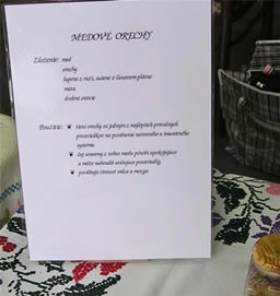 Med je nielen potravina, jeho priaznivé a liečivé účinky zistili mnohí vedci a lekári celého sveta pri mnohých chorobách, ktoré trápia ľudí. Jeho naturálne účinky a spôsoby využitia prezentovala p. Milada Ivánková. Množstvo zaujímavých receptov jej súkromnej zbierky určite obohatilo výstavu a dalo návštevníkom nejeden recept ako upotrebiť med vo svojej rodine a okolí.