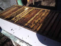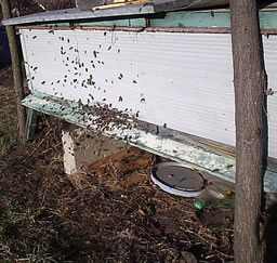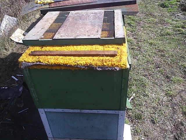Úľ z hora je uzatvorený obyčajnou pristrihnutou vrecovinou na celú plochu pôdorysu debničky (proti znečisteniu propolisom utepliviek) a na to kladiem tri vrstvy koberčekov (tie čo vyraďuje manželka z prevádzky). Je to dobré vzdušné zimovanie, cez ktoré stačí odchádzať vzduch (aj napriek tmeleniu vrecoviny), len je dôležité, aby na uteplivkách nebola položená priamo plechová strieška, aby sa na nej nezrážal vlhký vzduch. Ja to riešim vrchnákom so sieťou, otvory môžu byť i na bokoch vrchnáka.