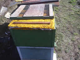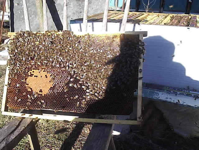 Plodový plást z 15.1, v pravo uložený novo prinesený peľ pri slnečnom počasí a teplote na včelnici pri 8-9°C. Nejedná sa o prírodný peľ (veď nič nekvitlo), je to vlastne kukupeľ z drvenej mliečnej kukurice uloženej v krechtoch /asi 150m od včiel/, konzervovanej kyselinou mravčou a propiónovou. Krecht v tom čase otvorili a včely zdroj našli. Uložený peľ v bunkách priamo fosforeskuje belobou. Ktovie, či by nestálo za pokus tento kukuričný produkt spracovať a tak ako niekedy sójapeľ podávať včelám v čase núdze.
