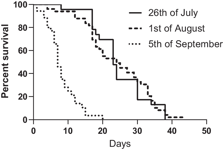 Významným zistením bol aj jasný sezónny trend v životnosti V. destructor. Mediánová životnosť výrazne klesala počas sezóny, najmä u roztočov udržiavaných na larvách a kuklách. V júni 2023 bol mediánový čas prežitia 53 dní, v júli 45 dní, a v septembri už len 8 dní. Tento pokles odzrkadľoval zhoršujúci sa zdravotný stav včiel spojený s vyššími hladinami vírusových infekcií, ktoré sa v danej geografickej oblasti vyskytujú typicky koncom leta.